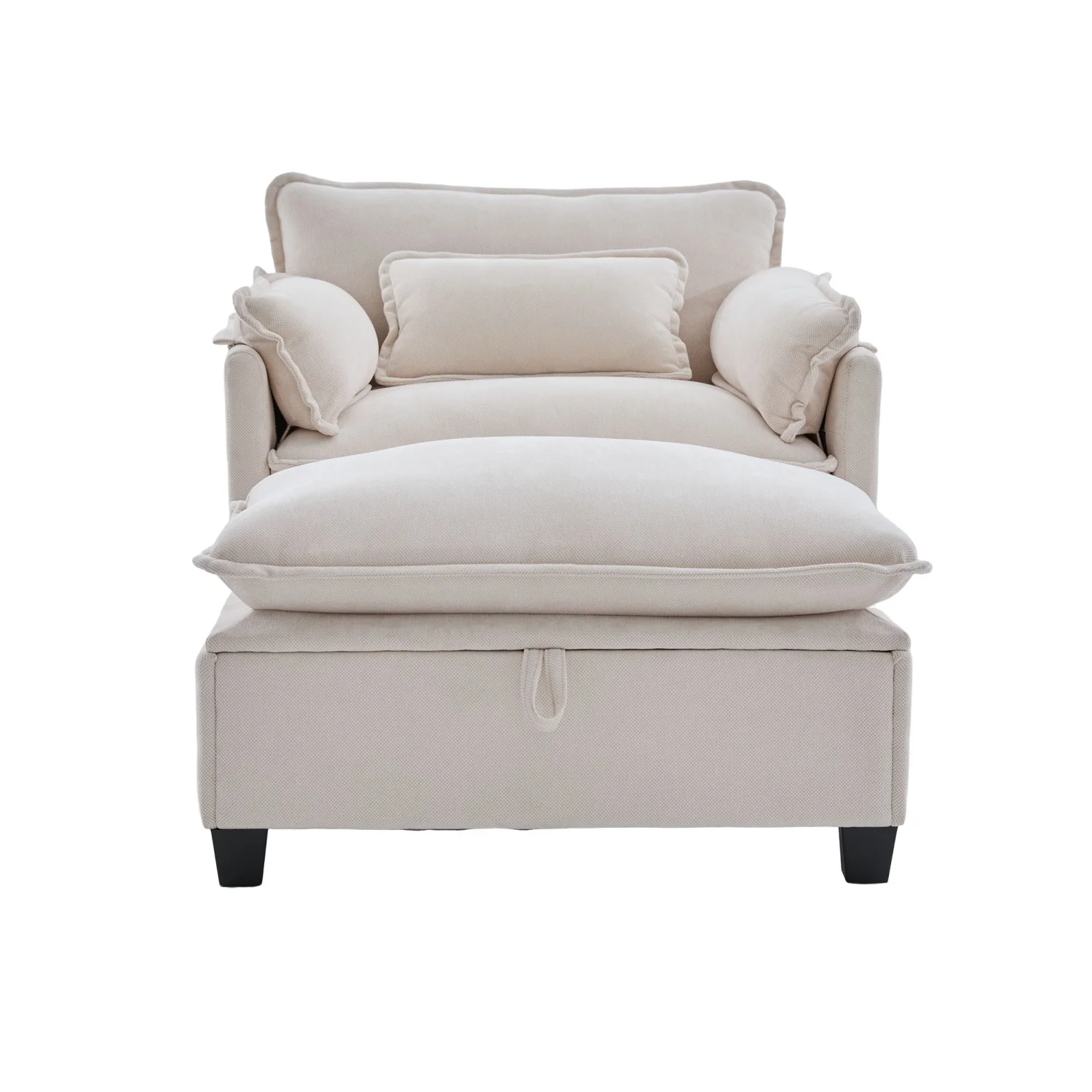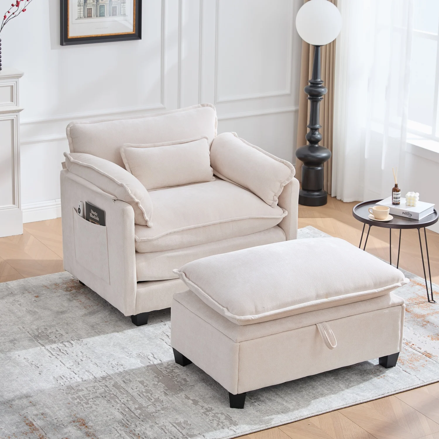 armchair with footrest and stool, velvet lounge chair with side pockets and pillows, comfortable reading chair for living room