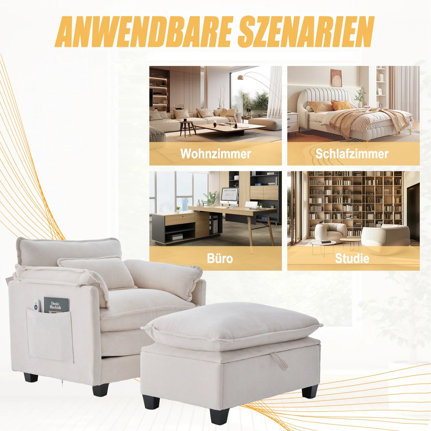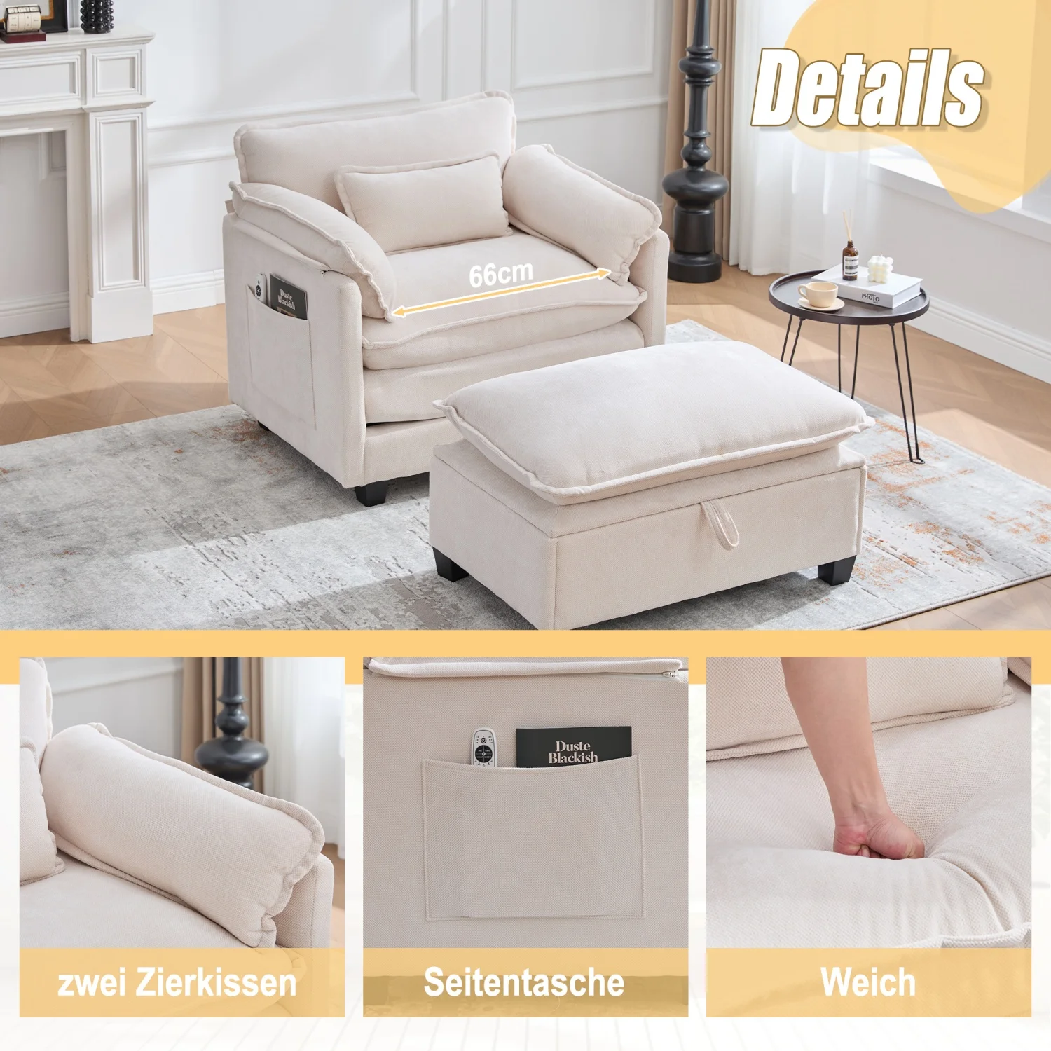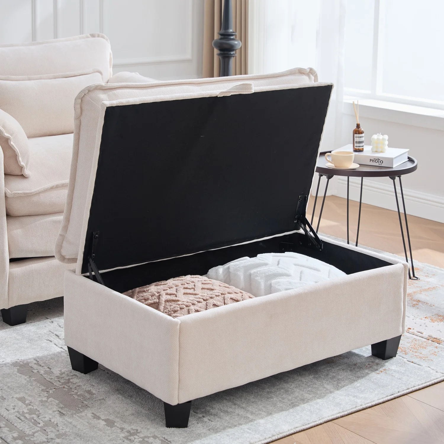 [Multifunctional storage foot stool] - Multifunctional storage foot stool - the right foot fortocks not only serves as a leg edition, but also has a hidden storage space that can easily save blankets, books, remote controls and other daily necessities in order to keep the living room properly and organized.