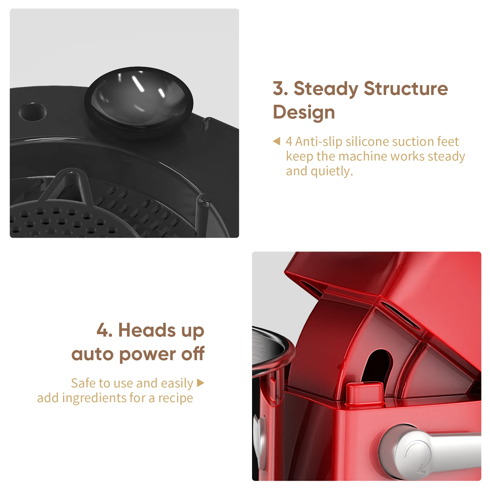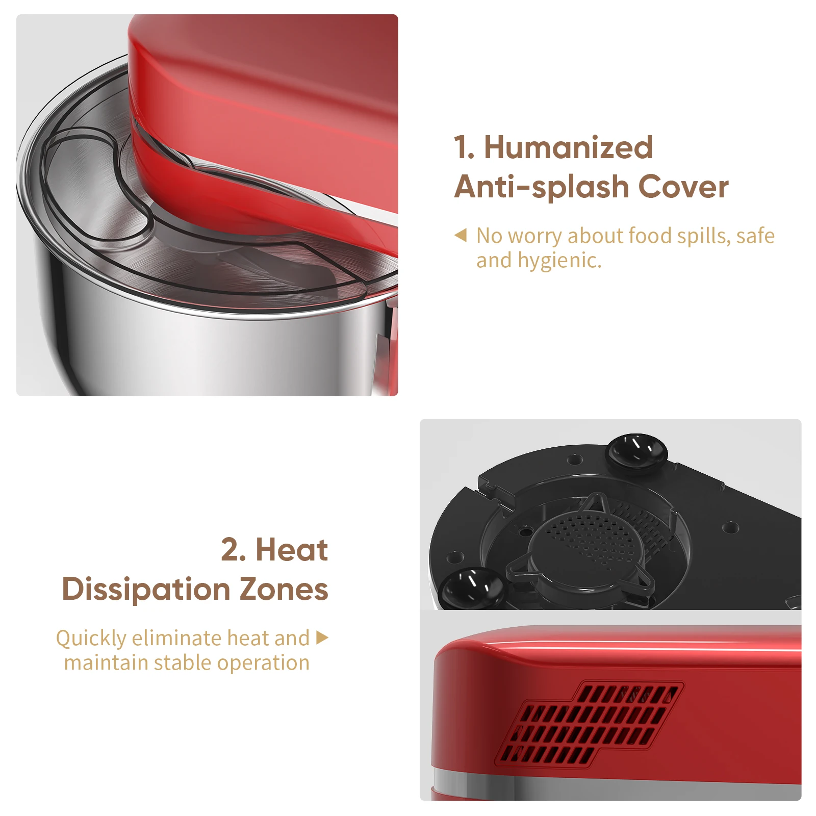 【Tilt Head Design】Not only switch the accessories conveniently but also take down the bowl easily. Alsobuilt head-up power failure protection feature will automatically shut the machine off when motor gets overheating.