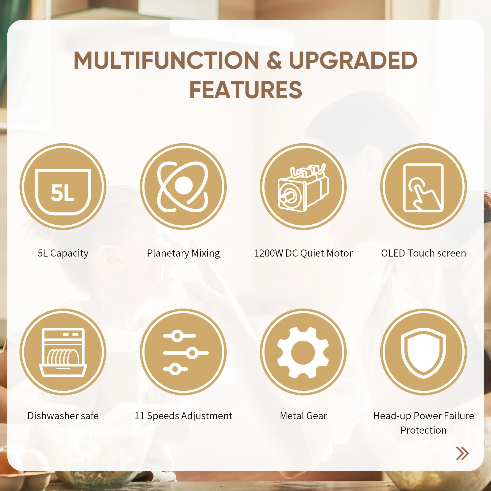 BioloMix Kitchen Food Stand Mixer, 1200W 11-Speeds DC Motor, Digital OLED Screen, Electric Food Mixer with Dough Hook, Whisk